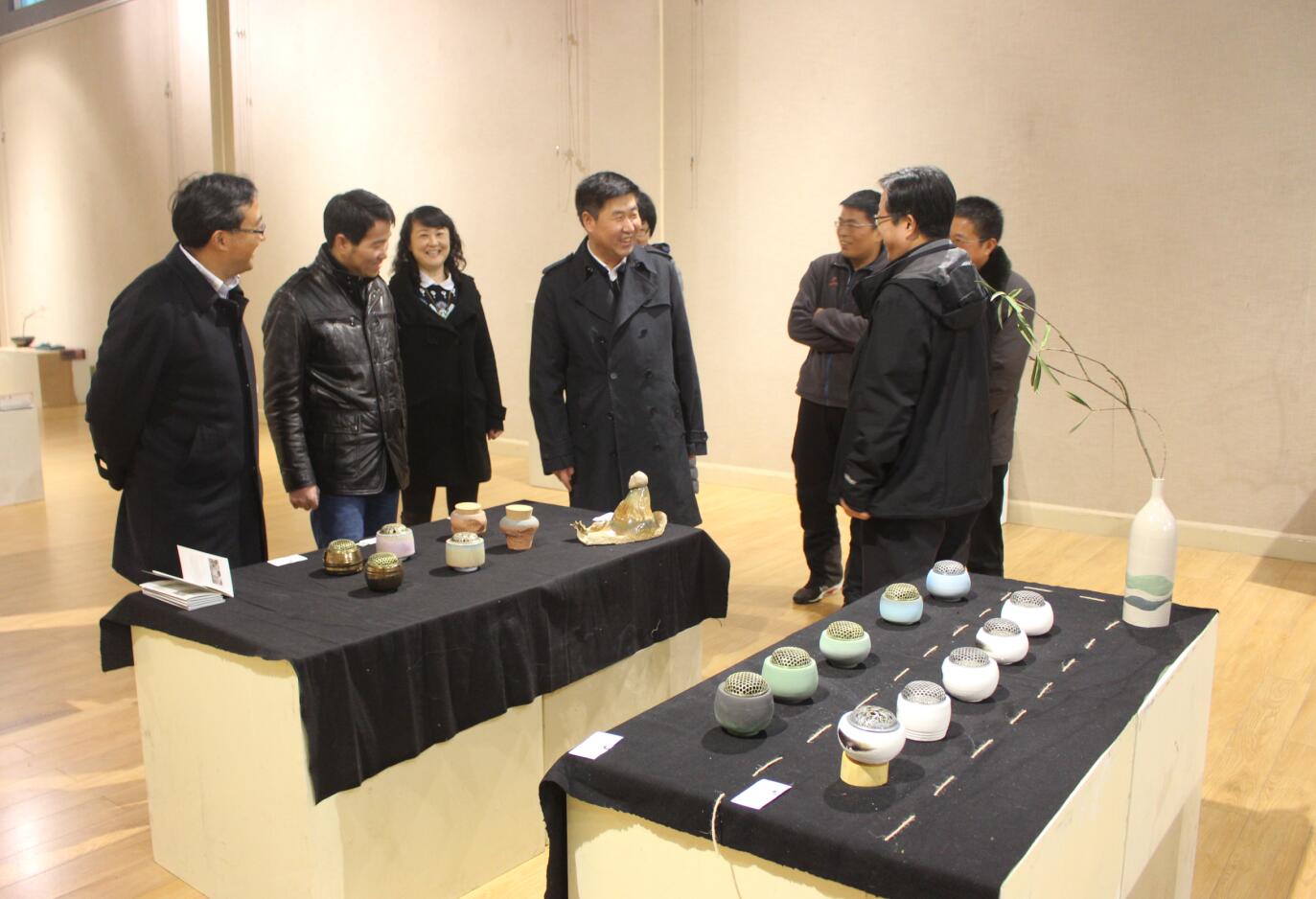 12月21日下午,校长宋争辉,副校长张力、郜火星一行来我院参观青年教师张睿“容·融”陶艺作品展,我院党委书记刘根货,副院长邹东升、张伟、李孝民、涂湘东全程陪同参观,教师张睿陪同讲解设计灵感与创作理念。