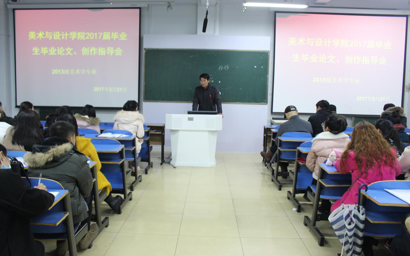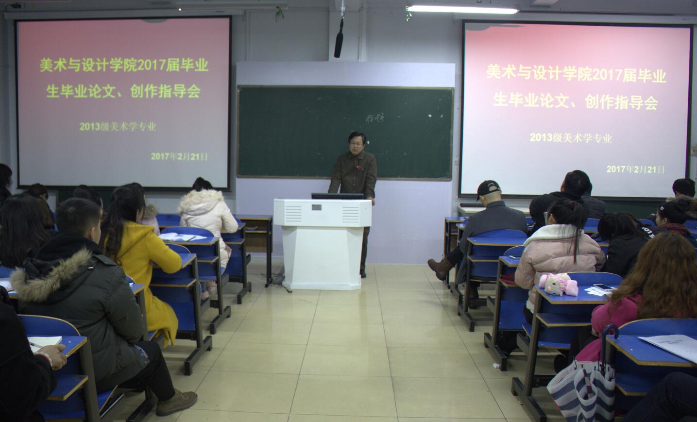 2月21日,太阳成集团tyc33455于艺术楼307室召开“2017届毕业生毕业论文与设计(创作)指导会”。我院党委书记刘根货,院长邹东升,论文指导教师,毕业班班主任与毕业生共同参与了此次会议,会议由副院长涂湘东主持。