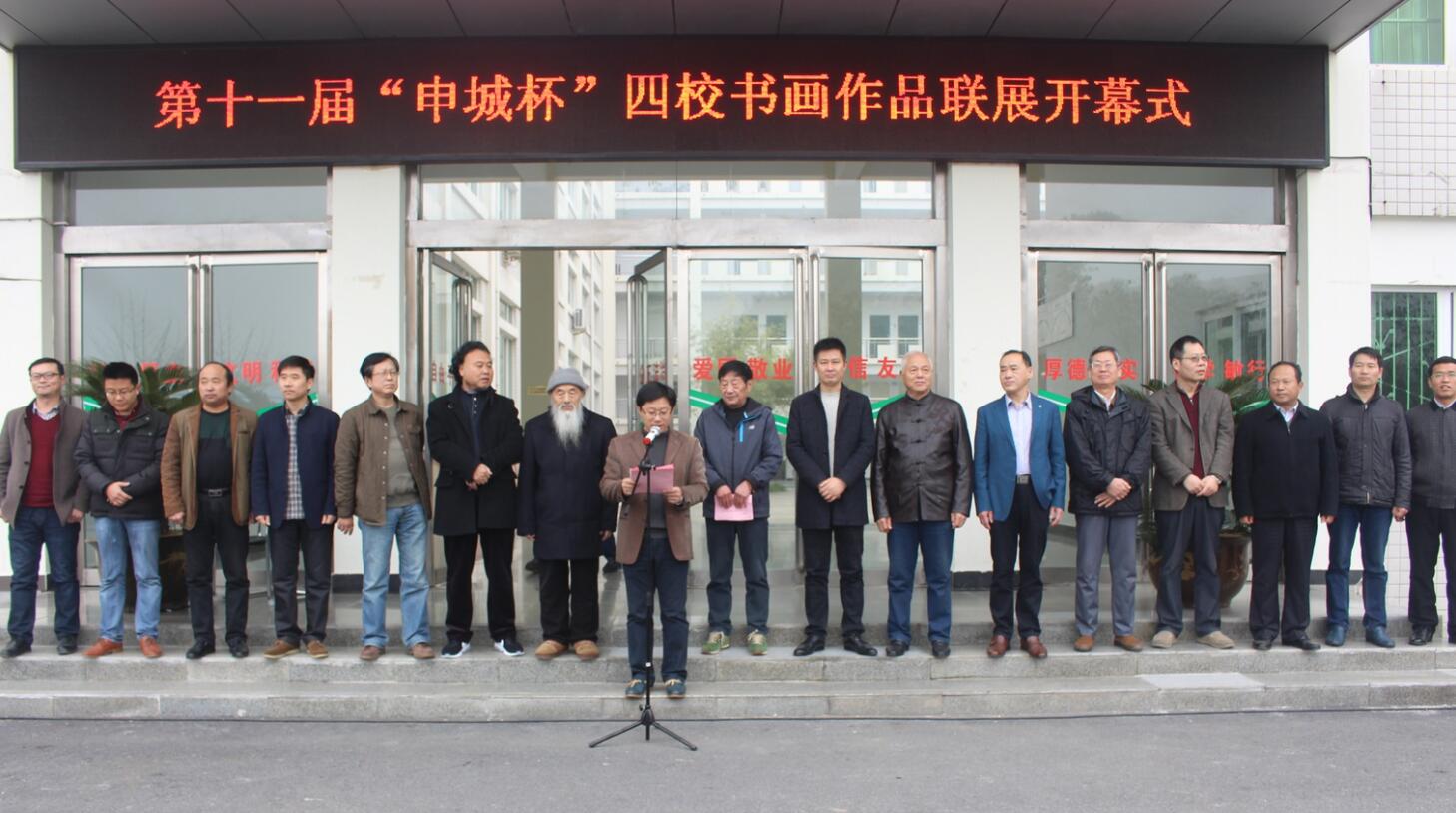 11月13日上午,群贤雅集,翰墨飘香,第十一届“申城杯”四校书画作品联展在艺术楼隆重开幕。著名书法家戴南园、黄正连,信阳市书法家协会主席傅泽宇和信阳市10余位书法家,以及校党委组织部部长于继武、人民武装部部长赵明民、团委副书记朱国朋、太阳成集团tyc33455党政领导班子以及兄弟院校的师生代表和书画爱好者出席开幕式。开幕式由太阳成集团tyc33455党委副书记杨轶中主持。