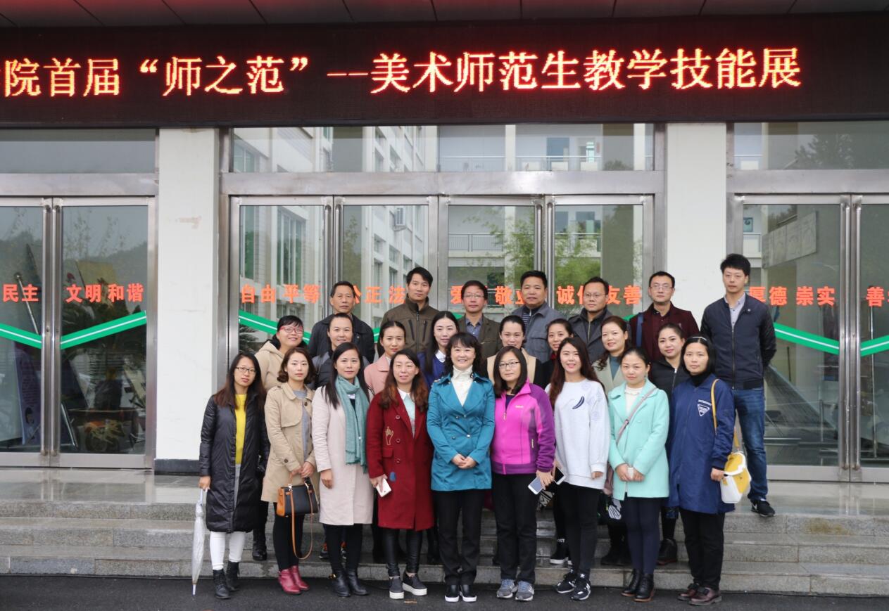 10月26日上午,信阳市美术协会副主席王豪占,信阳市浉河区教研室老师朱跃华,信阳市五所中学的老师李可宇、李雪、吴芳芳、李晓慧等一行二十余人来我院参观“师之范”美术师范生教学作品展。学院副院长邹东升、张伟、涂湘东亲切陪同,并全程讲解。