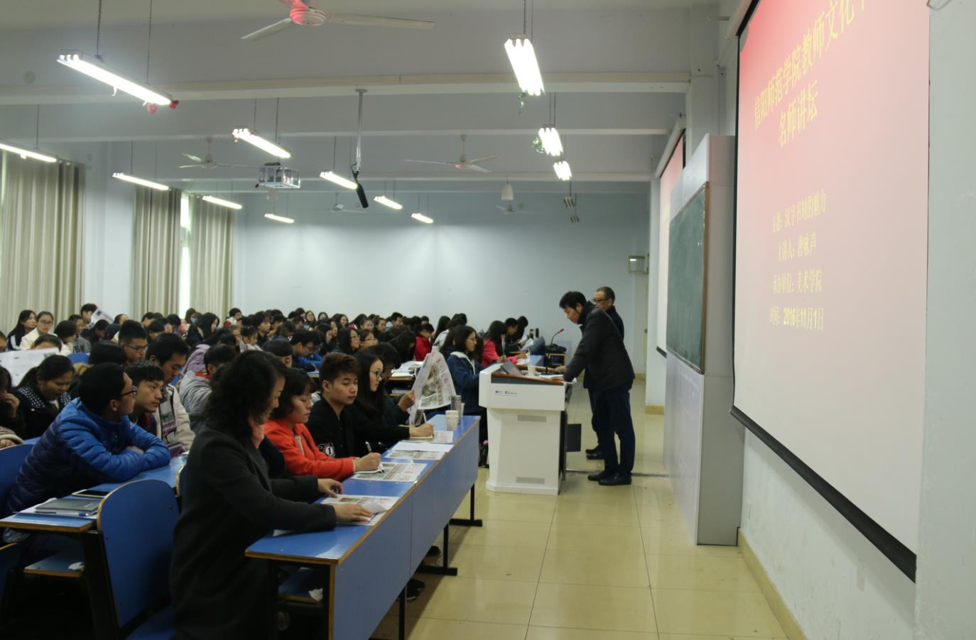 11月1日上午,由太阳成集团tyc33455承办的2016年教师教育文化节名师讲堂“汉字书刻的魅力”讲座于艺术楼307室开讲。中国书法家协会会员、河南省书法家协会篆刻专业委员会委员、河南印社理事唐咏声做客美术学院,为我院两百余名师生带来了精彩的一课。本次讲座由我院副院长邹东升主持。