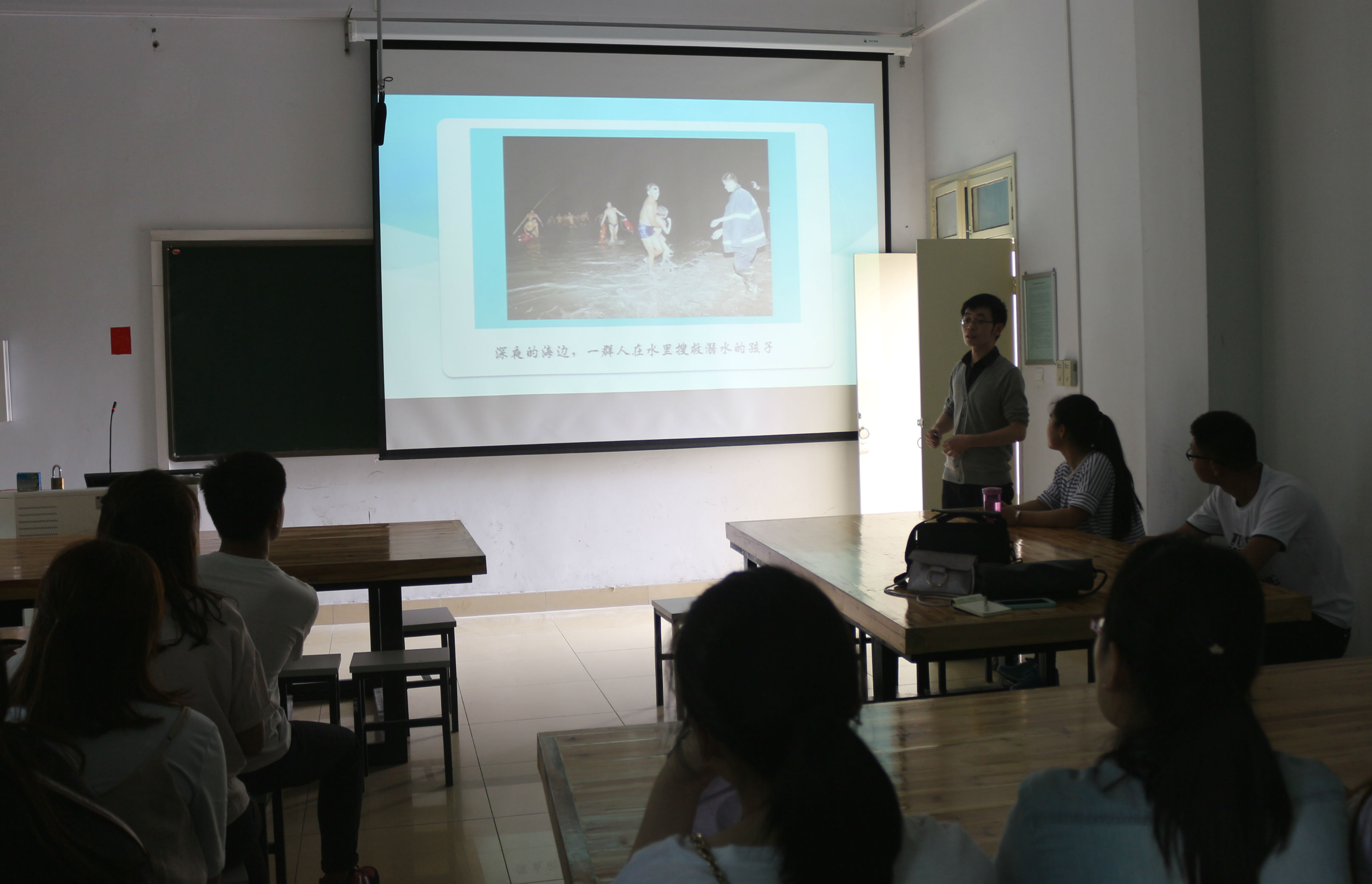 班会由主题导入、案例分析、理论传授和视频展示等四个部分构成。班会先以ppt形式展示了溺水的图片和数据,引起学生的警觉。随后,施远带领大家深入探讨溺水事故的典型案例。同学们仔细分析了案例中存在的问题,并对此进行激烈讨论。随后,施远就溺水后的自救、互救和急救等安全知识进行讲授,并通过视频展示“手拉手”救援的危险和心肺复苏术的做法。