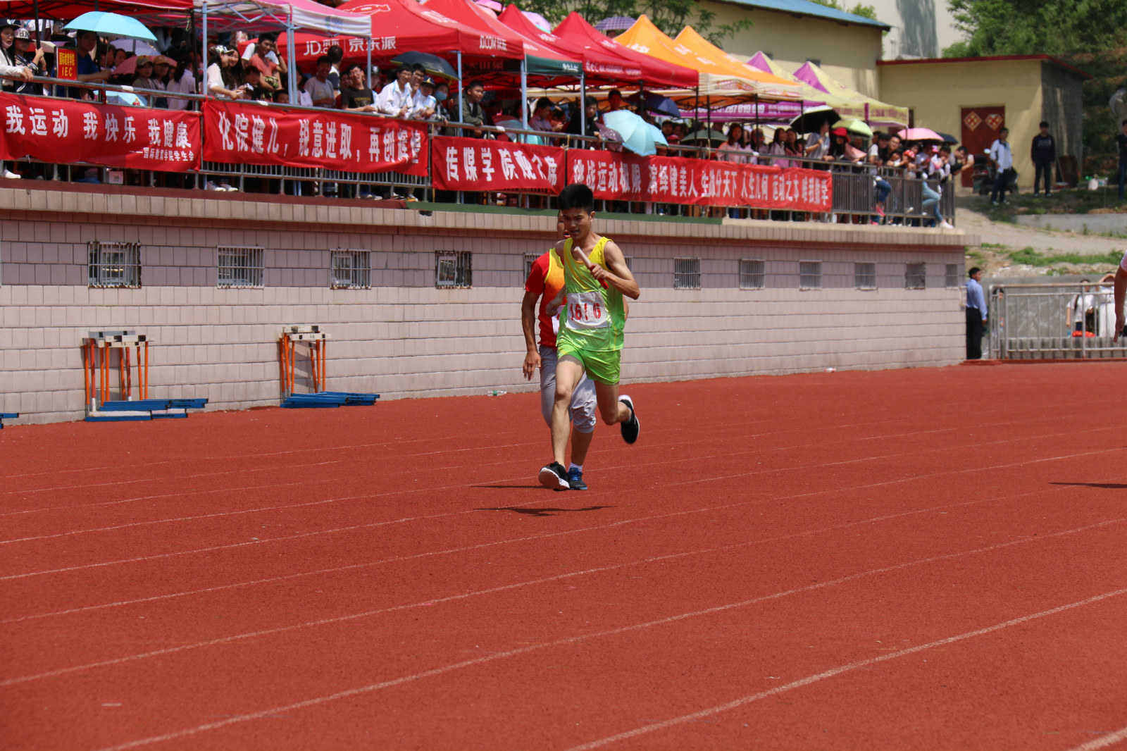 在为期两天的校运动会中,我院运动员参与其中多类项目,在田径运动场上留下了优异的成绩。比赛中,我院运动健儿尽显拼搏向上的精神。百米跑道上,他们的身影如离弦的箭般向前飞奔而去;四百米及八百米比赛中,他们不断超越,全力以赴,为美院增光添彩;接力赛中,他们共同展示团队力量;1500米长跑中,他们更是用汗水告诉我们坚持的重要;跳高跳远那一个个完美的跳跃,记录了他们激情的青春。比赛间,美术学院领导老师也来到现场为运动员加油助威。看台上鼓声隆隆、呐喊阵阵,现场观众用他们的热情感染着运动员,使运动员们一次又一次的爆发出自己的潜力。