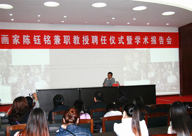 4月18日上午,信阳师范学院美术学院于艺术楼报告厅举行了陈钰铭先生兼职教授聘任仪式暨学术报告会。信阳师范学院副校长刘彦明、美术学院院长刘根货、党总支书记周子良、副院长张伟、副院长邹东升、信阳市美术家协会原主席赵根成、信阳画院院长兼美术协会副主席李一冉、信阳市书协付泽宇及美术学院全体师生和信阳市广大美术工作者参加了本次活动。活动由张伟副院长主持。