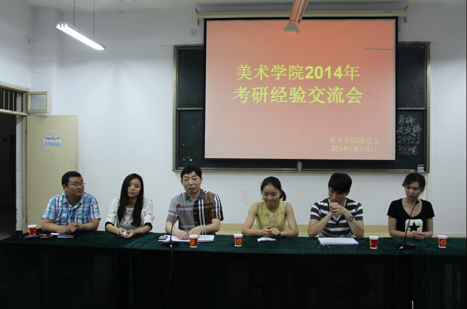 6月4日,美术学院在艺术楼307教室举办了2014年考研经验交流会。美术学院党总支书记周子良、团总支书记周贤亮、艺术设计教研室刘文忠老师与百余名有志于考研的学生一起参加了本次交流会。