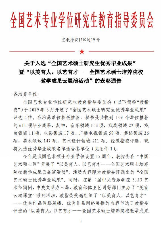 近日,全国艺术专业学位研究生教育指导委员会公布了“全国艺术硕士研究生优秀毕业成果”入选名单。我院邹东升教授、潘静副教授共同指导的2017级艺术硕士(美术)专业学位研究生苏畅同学的毕业成果(毕业论文、毕业创作)成功入选,并得到了教指委的通报褒奖。