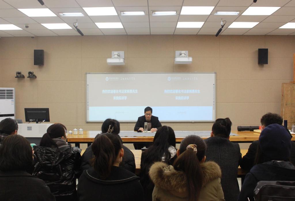 3月10日,应我院邀请,中国书法家协会会员、河南省书法家楷书委员会委员、信阳市书法家协会理事、潢川县书法家协会副主席熊愚先生到我院作学术讲座。我院副院长张伟副教授担任本次学术报告的学术主持,副院长邹东升教授及学院部分教师、研究生共同聆听了此次讲座。