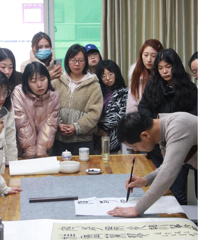 在展示环节,熊愚先生展示了自己临摹的《雁塔圣教序》作品,以及部分参赛作品原件,从临、研、创、裱等几个方面强调了作品的形成过程。在实践演示环节,熊愚先生挥毫泼墨,现场即兴创作了一件以校训“厚德崇实”为主要内容的书法作品,之后又以唐代诗人王维的《鸟鸣涧》为内容,创作了一件书法作品。在场师生交流互动不断,气氛活跃。整场学术报告持续了近三个小时,在热烈的掌声中结束。