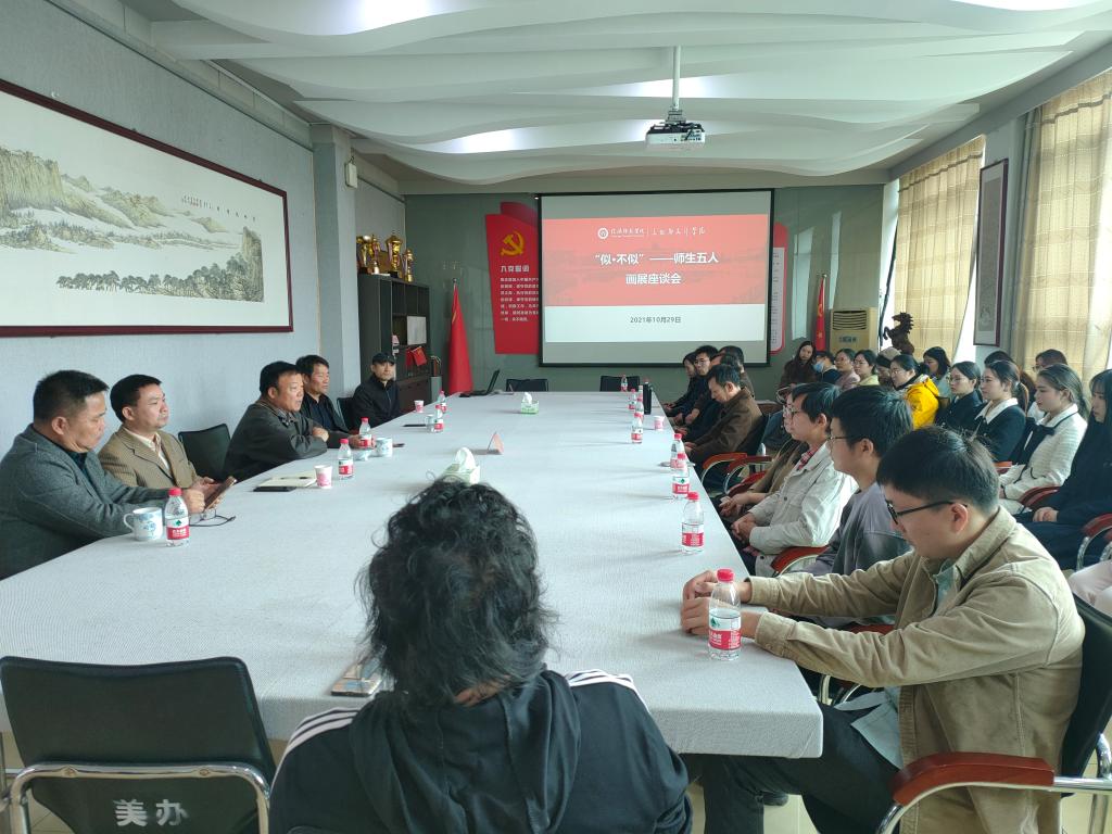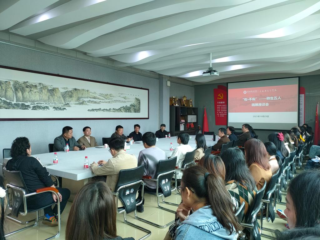 10月29日上午,我院在艺术楼二楼会议室举办了“似·不似”师生五人展座谈会。河南省美术家协会原副主席、人物画艺委会主任、河南大学教授、硕士生导师袁汝波,我院党委书记兰洋,院长邹东升,副院长张伟、张江波以及信阳市书画爱好者和部分师生共同参加了此次座谈会,座谈会由副院长张伟主持。