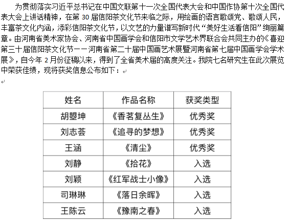 我院研究生在喜迎第三十届信阳茶文化节——河南省第二十届中国画艺术展暨河南省第七届中国画学会学术展中取得佳绩