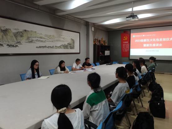 二是发放爱心大礼包,举办新生入学座谈会,了解新生入学状态。为了在第一时间将学校对2023级家庭经济困难新生的关怀之情传递到位,及时了解新生到校后的思想、心理及生活状况,9月13日,我院在艺术楼会议室开展“新生爱心大礼包发放仪式暨新生代表座谈会”。我院副书记周刚、全体辅导员及2023级新生代表20余人参加了座谈。会上周刚给新生送去了爱心大礼包,并表达了学院对新生的关怀,鼓励大家奋发向上,自强不息,让自己的大学生活出彩。