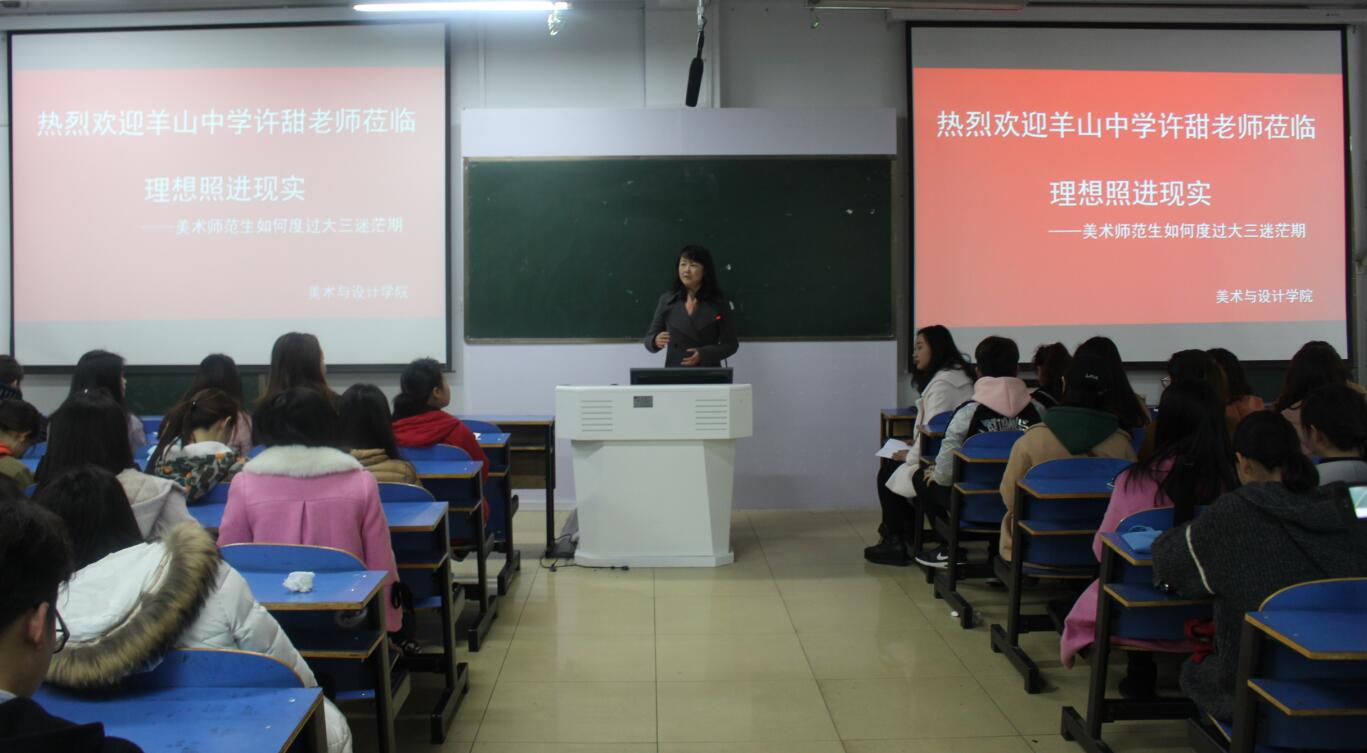 3月22日,应太阳成集团tyc33455邀请,信阳市羊山中学美术教师许甜在艺术楼307室作题为“理想照进现实——美术师范生如何度过三大迷茫期”的专题讲座,我院副院长涂湘东与近百名学子共同聆听了讲座,讲座由涂湘东主持。