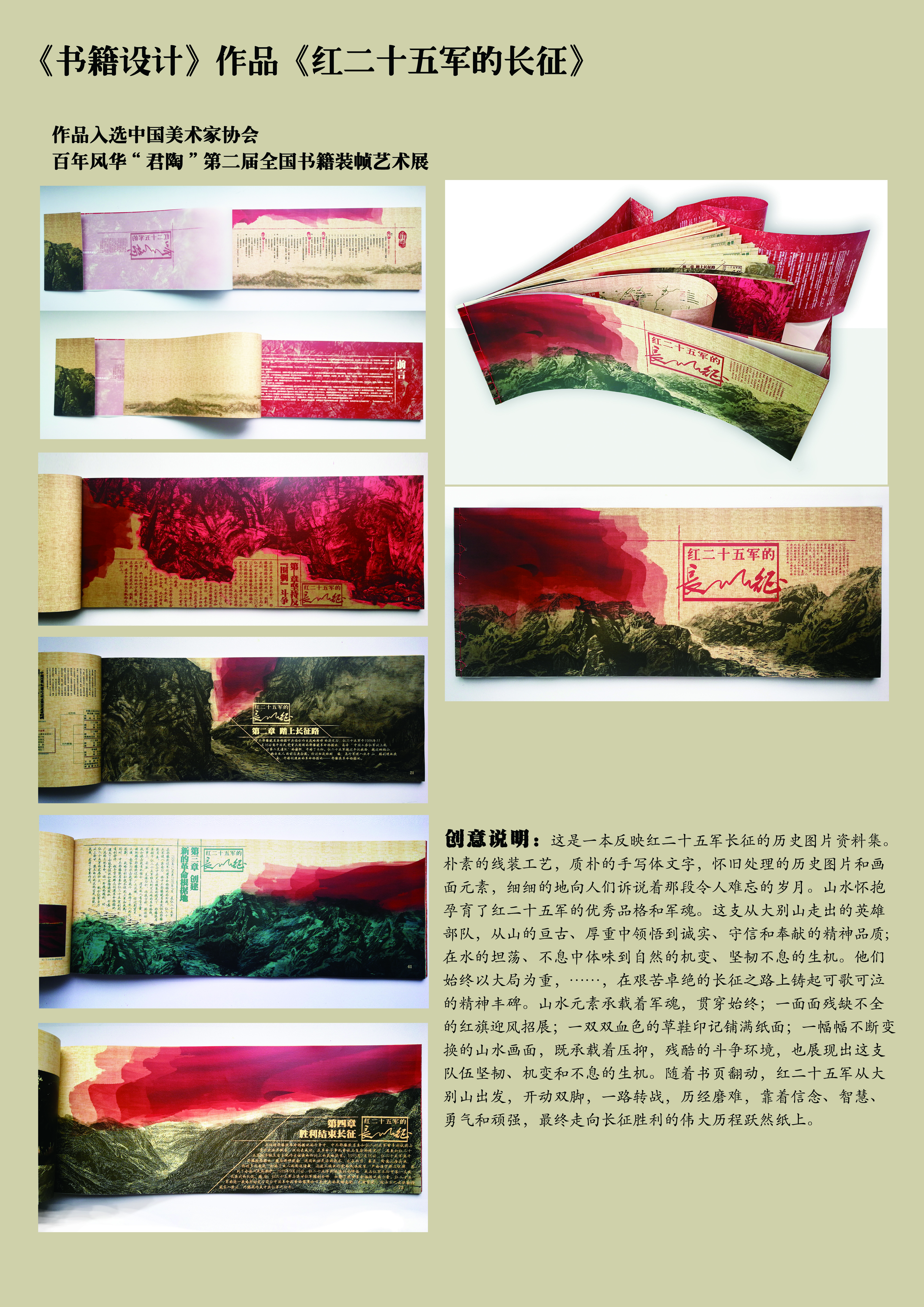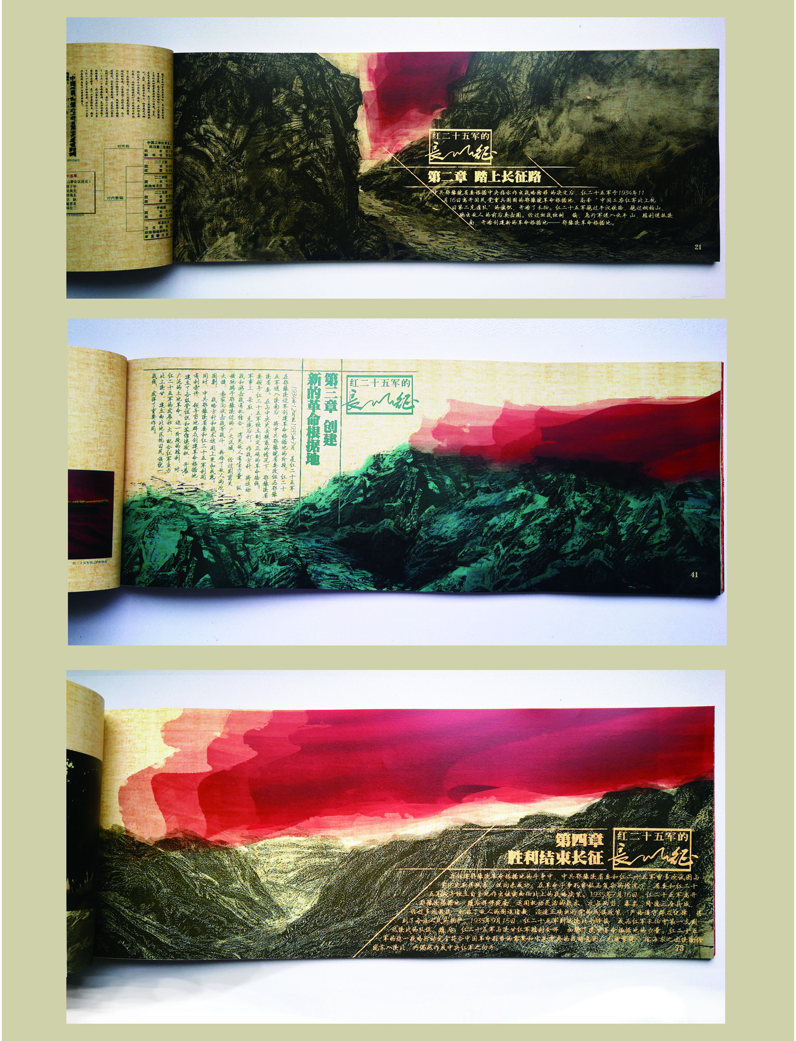 这是一本反映红二十五军长征的历史图片资料集。朴素的线装工艺,质朴的手写体文字,怀旧处理的历史图片和画面元素,细细的地向人们诉说着那段令人难忘的岁月。山水怀抱孕育了红二十五军的优秀品格和军魂。这支从大别山走出的英雄部队,从山的亘古、厚重中领悟到诚实、守信和奉献的精神品质;在水的坦荡、不息中体味到自然的机变、坚韧不息的生机。他们始终以大局为重,……,在艰苦卓绝的长征之路上铸起可歌可泣的精神丰碑。山水元素承载着军魂,贯穿始终;一面面残缺不全的红旗迎风招展;一双双血色的草鞋印记铺满纸面;一幅幅不断变换的山水画面,既承载着压抑,残酷的斗争环境,也展现出这支队伍坚韧、机变和不息的生机。随着书页翻动,红二十五军从大别山出发,开动双脚,一路转战,历经磨难,靠着信念、智慧、勇气和顽强,最终走向长征胜利的伟大历程跃然纸上。